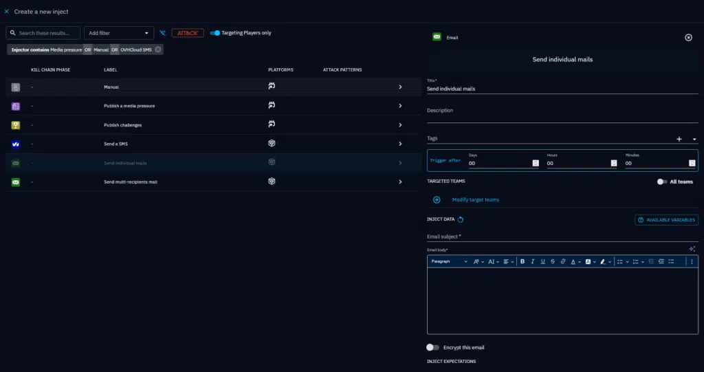With OpenBAS you will have access to a range of injects to animate your scenarios: