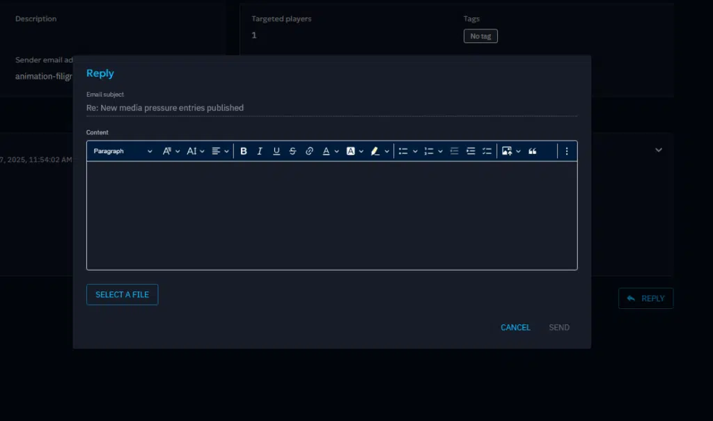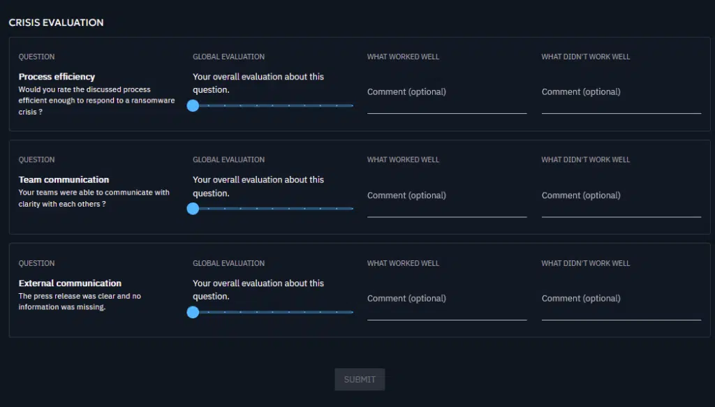 To gather your players’ feedback and to get contextual insights about their experience, OpenBAS allows you to send surveys and centralize the feedback in your simulation page.