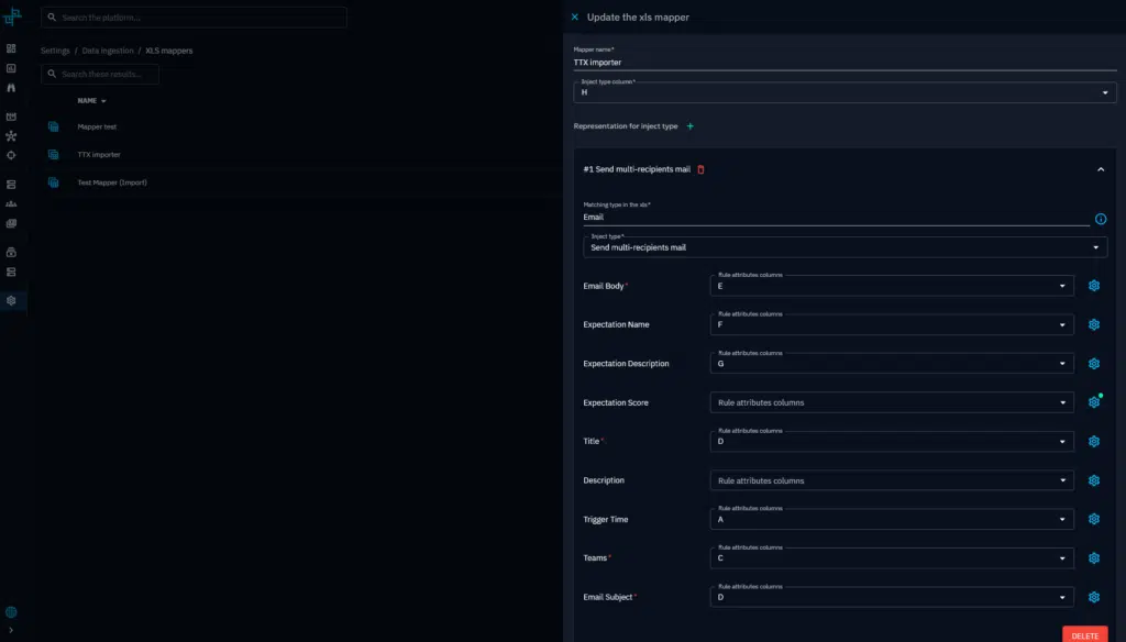 Alternatively, you can import your whole scenario, add your teams and set your expectations using our XLS mapper. You will need to provide in input an .xls chronogram of your scenario and create a mapper to ingest correctly the data.