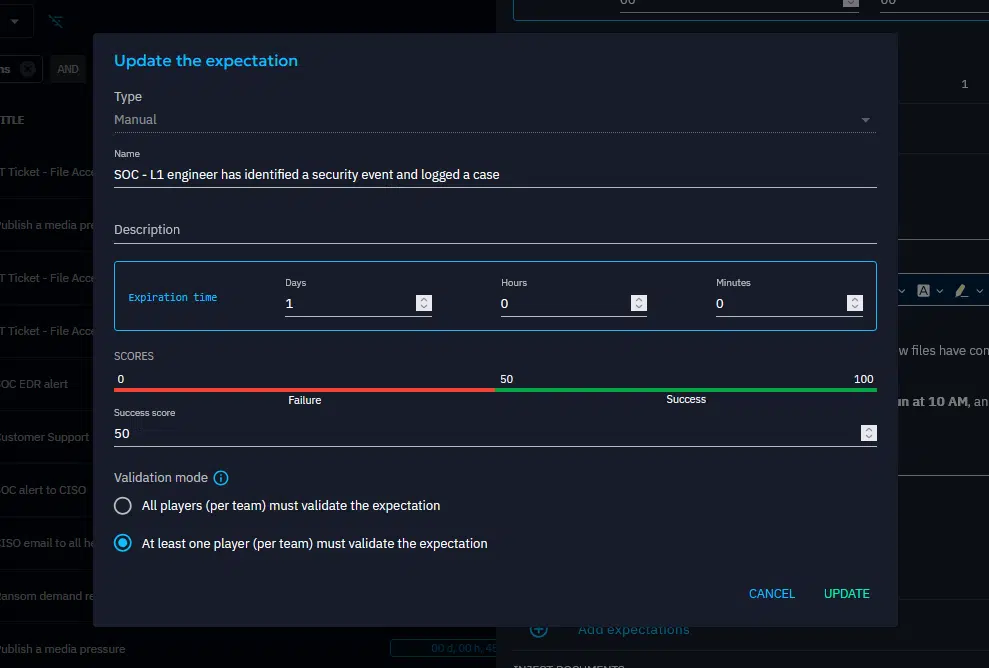 Expectations are criteria of evaluation that you can attach to inject, they are not mandatory but are very much recommended. They are key to assessing the success of your teams and identifying what best practices to implement.