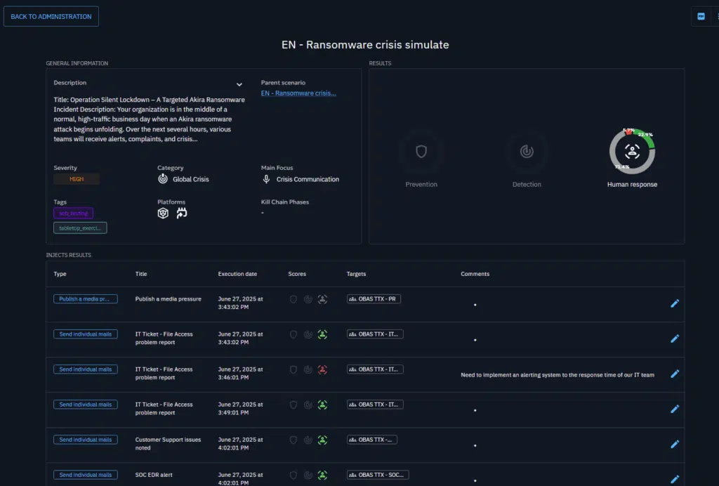 You will be able to do so directly from within OpenBAS through our report capability that will aggregate the results of the simulation, allow you to add comments on any specific inject, detail notes about the whole simulation, and to export everything as a PDF report.