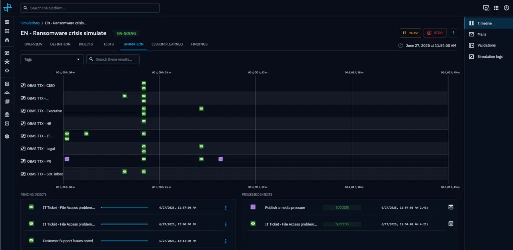 Once you have created your injects, you can use the animation view to visualize how your scenario will unfold and how your teams will be impacted on a timeline.