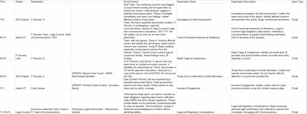 For this exercise, we will focus on a ransomware attack scenario. This highly relevant and pervasive threat provides an excellent scenario to evaluate an organization’s preparedness across multiple domains, including technical response, communication protocols, and business continuity.