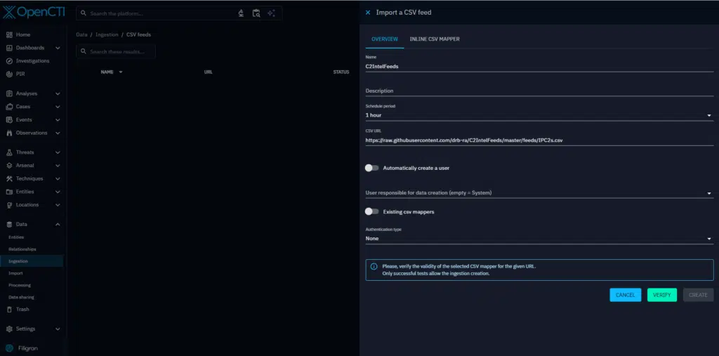 Within OpenCTI, you can already leverage these CTI Feeds via the Data menu (ingestion > CSV) by associating the CTI Feed’s URL to an appropriate CSV mapper. But let’s be honest: everyone has been doing it their own way, manually and often from scratch. So, we asked ourselves : why not make this simpler and more efficient!