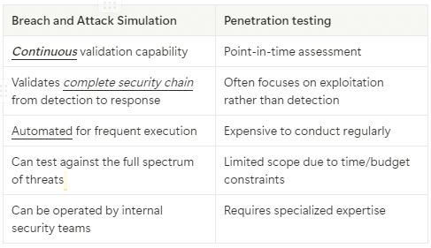 As you can see, BAS complements penetration testing by enabling continuous validation of detection and response capabilities as well as providing ongoing assurance between periodic penetration tests. While penetration tests excel at finding unknown vulnerabilities, BAS excels at validating whether known attack techniques would be detected and effectively countered.