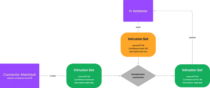 This mechanism relies on the Confidence Level attribute of each STIX Object, as well as identification keys for each Object. If an Object is created with the same identification keys as an existing one, it will replace the existing Object only if the Confidence Level of the new Object is higher or equal to the existing one’s.