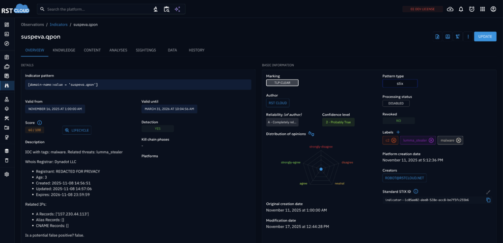 - RST Whois API delivers enriched domain and IP intelligence that flows naturally into OpenCTI’s infrastructure analysis workflows.