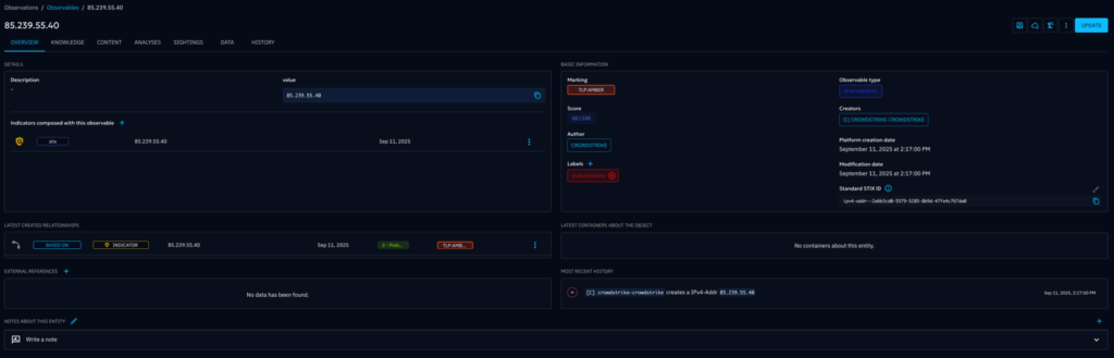 When new threats emerge, every second counts. OpenCTI automatically pushes relevant indicators to Falcon Insight XDR, enabling detection and prevention across managed endpoints. This automation minimizes manual processes and ensures you’re continuously protected against the latest threats.