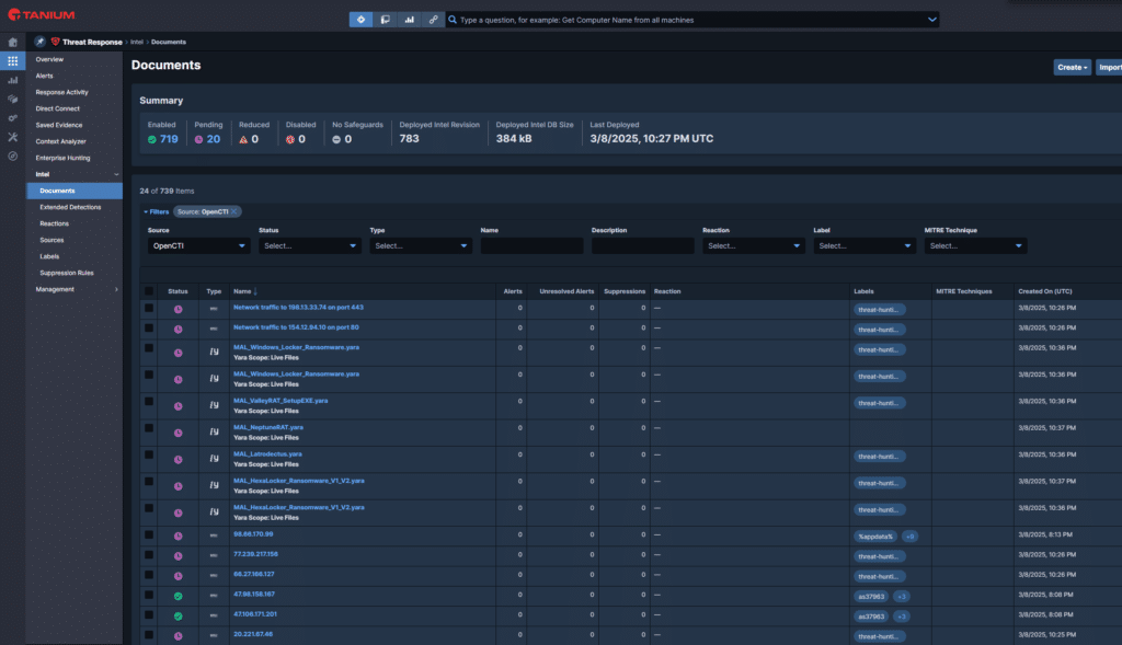 A standout feature of this integration is Tanium’s ability to implement YARA (Yet Another Recursive Acronym) rules sources from OpenCTI. This capability, unique among many EDR (Endpoint Detection and Response) solutions, allows for more advanced pattern matching and malware detection.