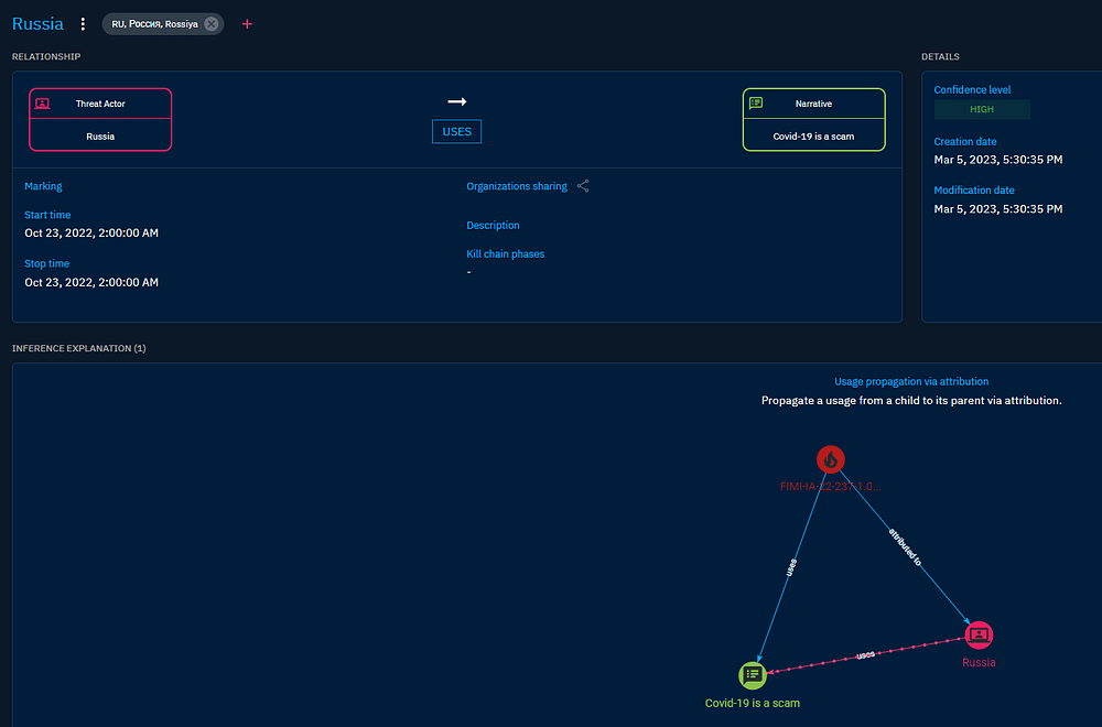 Even if this is still on-going work, this model is already available in the platform and used by disinformation analysts in several public and private organizations, starting to be shared and discussed in training courses, workshops as well as high-level groups of experts.