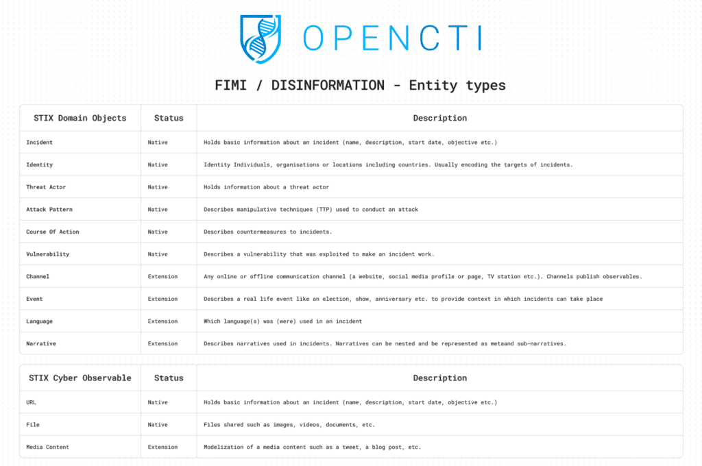 The first work released end of 2022 in the OpenCTI platform was the extension of the STIX 2.1 standard, in coordination with the DAD-CDM (Common Data Model for Defending Against Disinformation) subcommittee of the OASIS Open CTI Technical Committee.