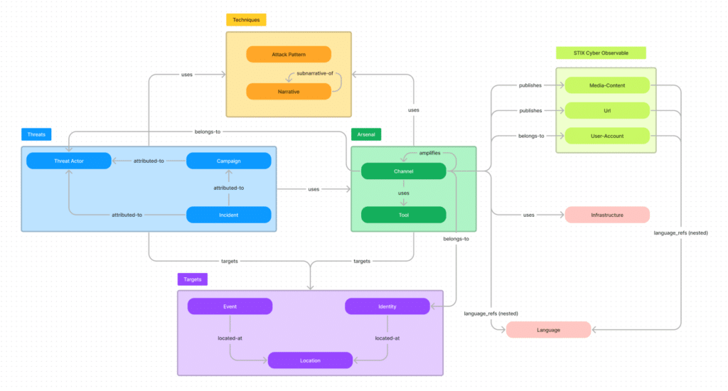After multiple workshops and discussions with at least 10 different organizations globally, we came to a first modelization which respects the overall STIX 2.1 philosophy, the already existing taxomies and doctrines to store cyber threat intelligence pieces of knowledge and the requirements of FIMI defenders community.