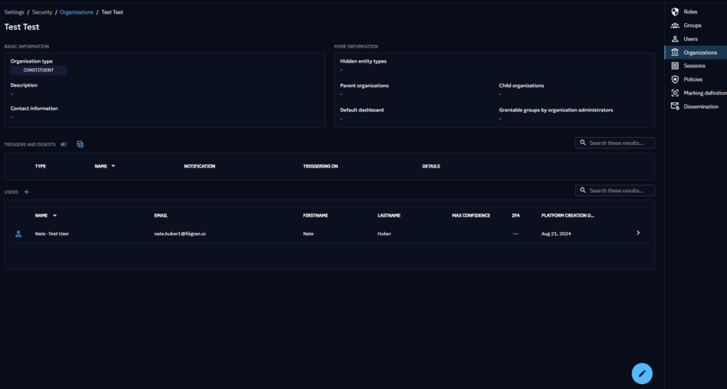 Although not a requirement with RBAC, organizations can be extremely useful in structuring data access and sharing within a single or multiple OpenCTI platforms. Customers can use organizations to mirror their internal structure by assigning different units to different organizations within OpenCTI and creating workflows where reporting is shared between the organizations. Organizations are also useful for ISACs, where there is a parent organization with broader access and capabilities within the platform, and child organizations through which the parent organization can share data and intelligence with the child organizations. Organizations don’t control what information users have access to nor user capabilities, as those functions, as described above, fall under groups and roles. As a result, organizations can be made up of users who have different types of access, based on the groups and roles to which they are assigned.