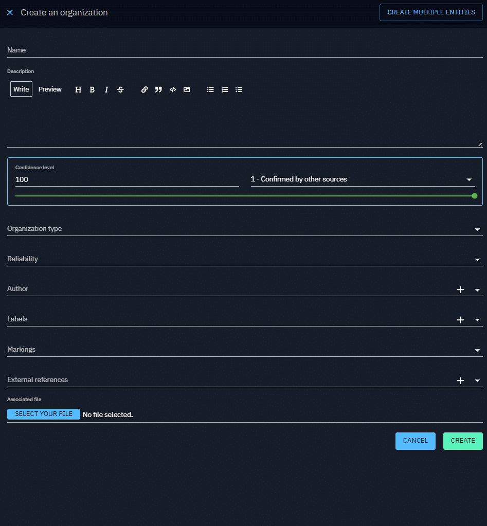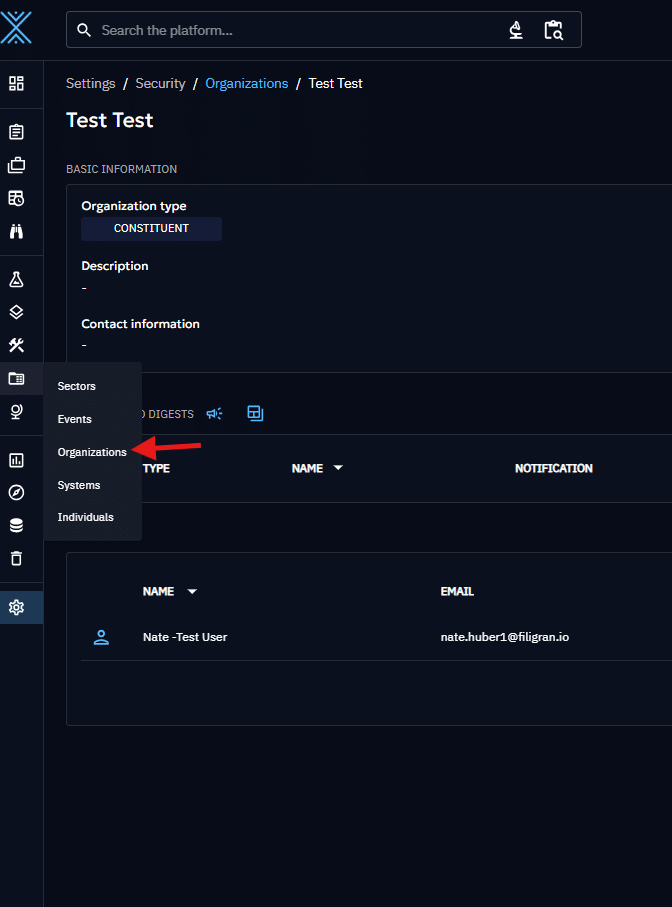 Within OpenCTI, users need to create organizations under the Organization entity found on the left menu. A user cannot create an organization under Security. The reason for this is that an organization within OpenCTI can act both as an entity that a user wants to track as well as an administrative function that includes OpenCTI users and a place where users can share information between organizations. Once that individual organization is created, it will show up under Settings > Security > Organizations.