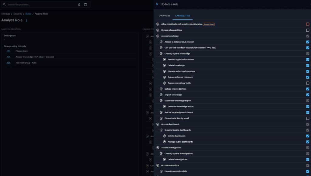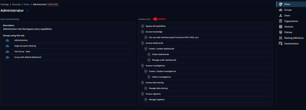 Roles are the final required field for RBAC within OpenCTI. Under roles, users are assigned capabilities in OpenCTI. These capabilities describe what a user can do within the platform. Capabilities range from read-only access to bypass all capabilities or an administrator role. The more capabilities a user has, the more actions they can take within the platform. Administrators should have bypass all capabilities, and certain super admin users should also have the capability to access and modify sensitive configurations, also known as the Danger Zones. You can update the capabilities of a role by going into the role, selecting the blue pen at the bottom of the page, clicking on the capabilities tab, and selecting the pertinent capabilities for that role.