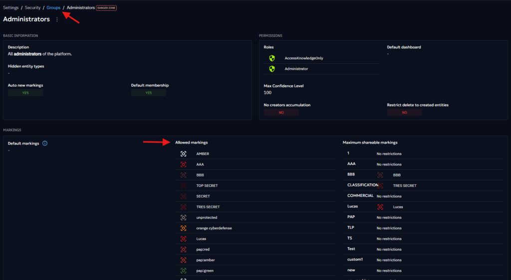 For example, if you are a user and are assigned to a group that has TLP markings assigned up to TLP:RED, you will be able to see all information within OpenCTI up to and including TLP:RED, however, if you are in a group that only has access to TLP:AMBER-STRICT, you will not be able to see any data with a TLP marking most restrictive than TLP:AMBER-STRICT. If a user is assigned to multiple groups, which the platform allows, that user will be able to see all information up to and including the most restrictive marking of all the groups the user belongs to. In other words, if a user is in one group that includes up to TLP:AMBER-STRICT marking and another group with up to TLP:RED marking, that user will be able to see information up to TLP:RED.