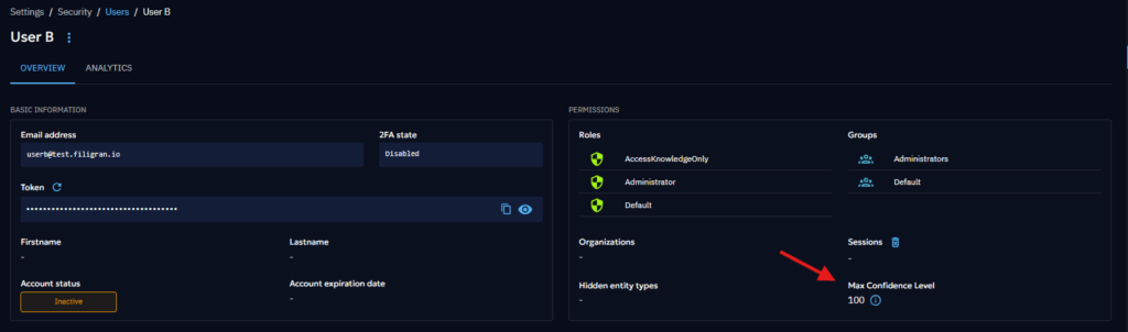 The first function new organizations using OpenCTI should set up in OpenCTI are individual user profiles. Every individual who needs to use OpenCTI must first have a user account. One of the main fields within the user profile is the user confidence level. This confidence level, which ranges from 0 to 100, tells the system the maximum confidence level at which the user is permitted to make edits. All entities within the platform have an overall confidence level. If a user has 100 percent confidence, they can edit any entity they have the capability to view within the platform, as long as they have the correct TLP markings and role capabilities, both of which we will discuss later. If a user has a lower confidence level assigned to them, such as 65 percent, that user can only edit entities that have a confidence level of 65 or lower.