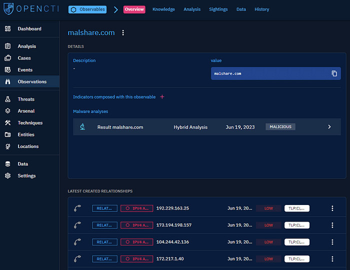 To simplify the triage process of cases which include artifacts, OpenCTI provides integration with various sandboxes such as VirusTotal, Hybrid Analysis, Joe Sandbox, and Hatching Triage.