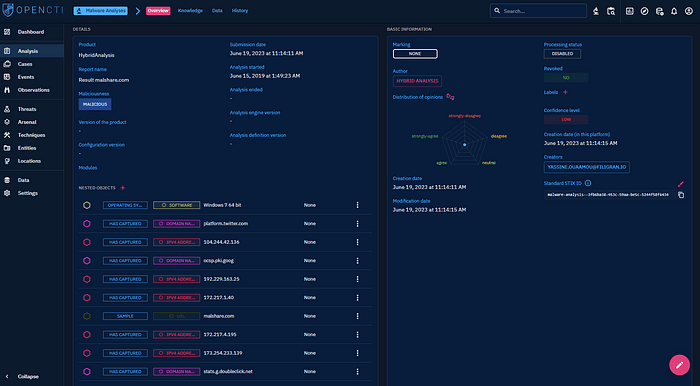 In accordance with the STIX 2.1 standard, we have implemented the malware analysis entity type within the platform to ease analysts work in the context of cases and investigations.