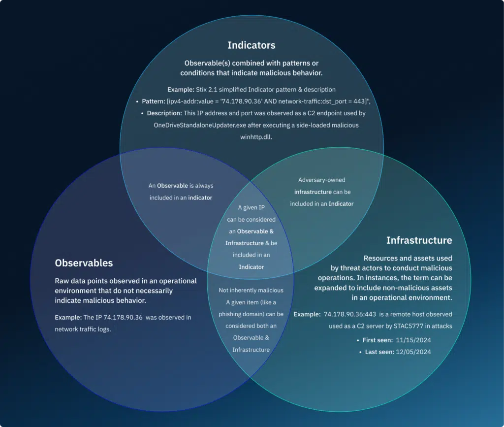 Indicators, or Indicators of Compromise (IOCs), are Observables enriched with context to signify potential threats. An Indicator typically includes a pattern or logic that defines the conditions in which an Observable might be a threat.
