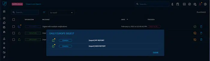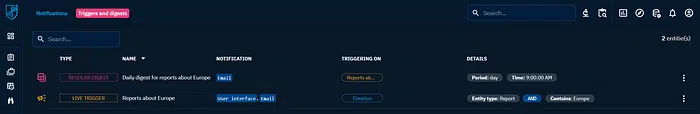 All the users in the platform can now define its own live triggers or regular digests to listen for a subset of knowledge in the platform. This concerns data directly created by connectors and/or users but also inferred / auto-generated information: everything is completely accessible.