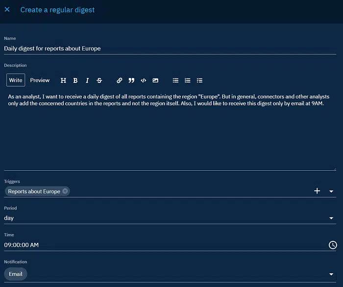 As an analyst, I want to receive a daily digest of all reports containing the region “Europe”. But in general, connectors and other analysts only add the concerned countries in the reports and not the region itself. Also, I would like to receive this digest only by email at 9AM.