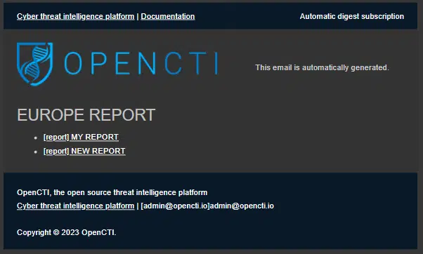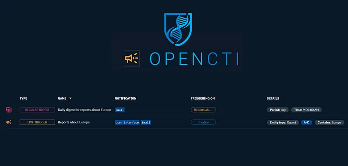 This manager is responsible for the distribution of the notifications through multiple outcomes. For now, OpenCTI supports user interface and email outcomes out-of-the-box (templates are hardcoded). But we plan to release very soon built-in webhooks and new connectors able to consume the notification stream (both live and digests) to extend integrations. Also, the templating will be open for configuration.
