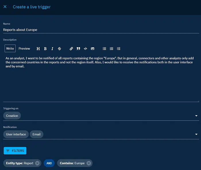 With this configuration, all reports in the platform that will be linked to Europe (directly or through inference) will generate a notification both in the user interface and by email.