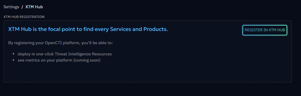 - In OpenCTI, navigate to Settings > XTM Hub.