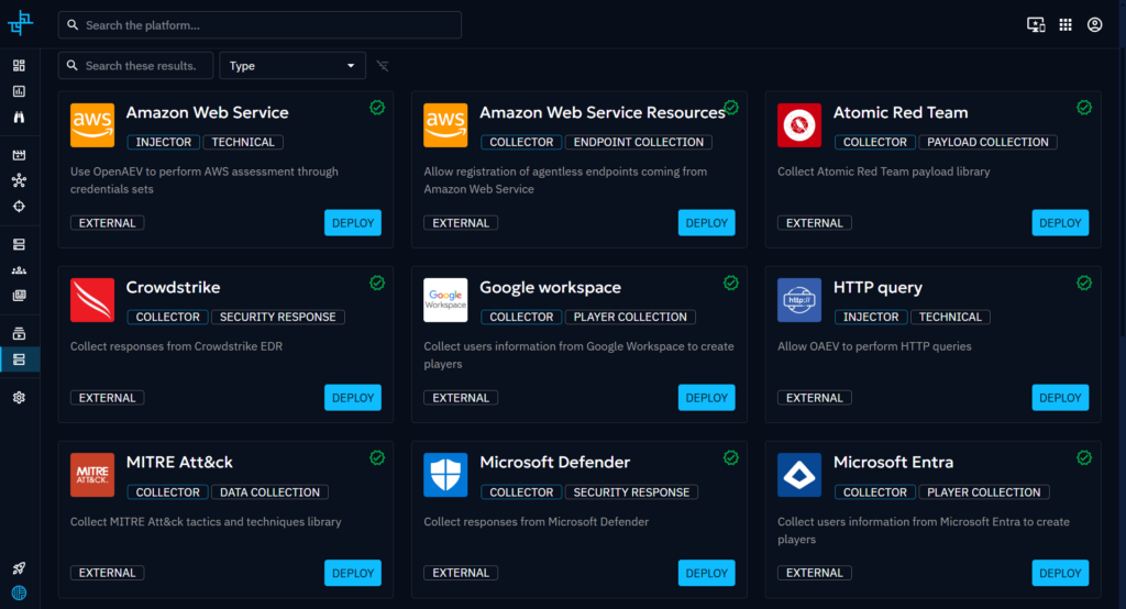 You can now browse through a full catalogue of pre-configured injectors, collectors, and executors to deploy directly from OpenAEV. This simplification, which replicates the OpenCTI Integration Manager, enables users to install and modify their integrations from the platform, removing the headache of having to perform manual configurations.