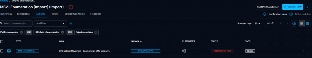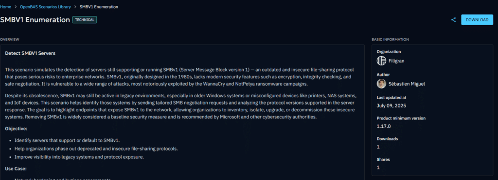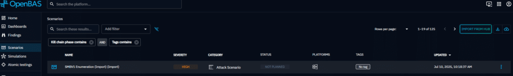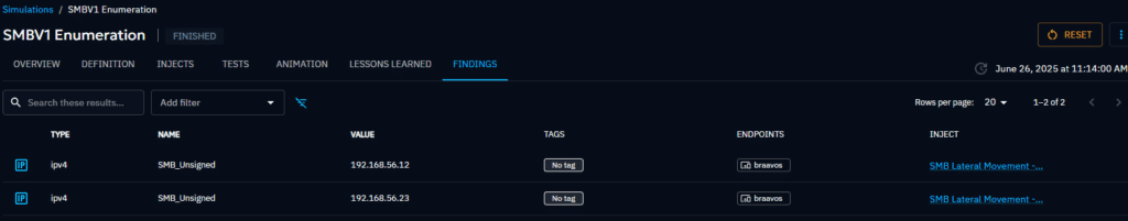 For example, if you downloaded the Scenario “SMBV1 enumeration”, you will then find your SMBV1 servers into the “Findings tab” + Detection & Prevention by your security systems on this attack into the Simulation’s Overview: