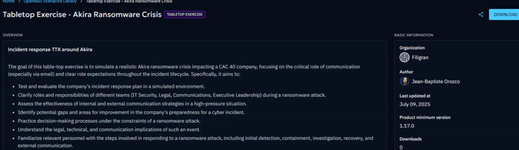 XTM Hub is Filigran’s free knowledge-sharing platform designed for the community. Today, we’re expanding its content with ready-to-use OpenAEV Scenarios developed by our team to strengthen your cyber resilience. Whether you’re simulating an APT-led cyber crisis or validating technical configurations, these scenarios are immediately actionable. You can now download them and import them inside of your OpenAEV instance.