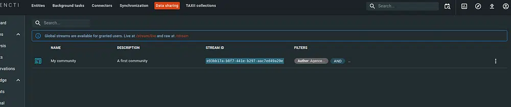 An out-of-the-box live stream without any filter is available by default on the URL: http://opencti/stream/live. To access it, the logged in user must have the capability “Connect and consume the platform stream”. The available content is also implicitly filtered with the allowed marking definitions (aka data segregation).