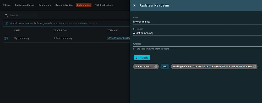 Beyond default raw and live streams, any user with the appropriate capabilities can also create his own live streams with filtering and group access restrictions directly in the OpenCTI user interface.