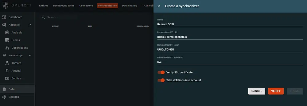 Since OpenCTI 5.0.0, a built-in synchronization management feature is available in the user interface. To create a new synchronizer, an administrator should know the remote OpenCTI URL, token and live stream ID to consume. This, the embedded process will connect to the live stream of the remote OpenCTI, get the data as soon as its published in order to “create/update/delete” the elements.