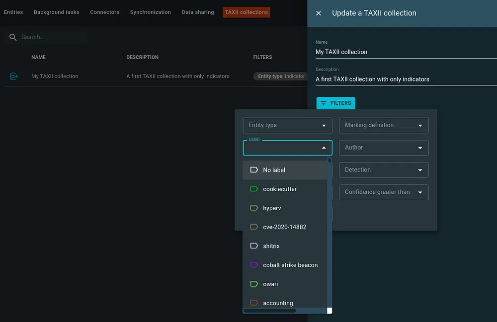 In OpenCTI you can create as many TAXII 2.1 collections as needed. Each of them can have specific filters to publish only a subset of the platform overall knowledge (specific types of entities, labels, marking definitions, etc.).