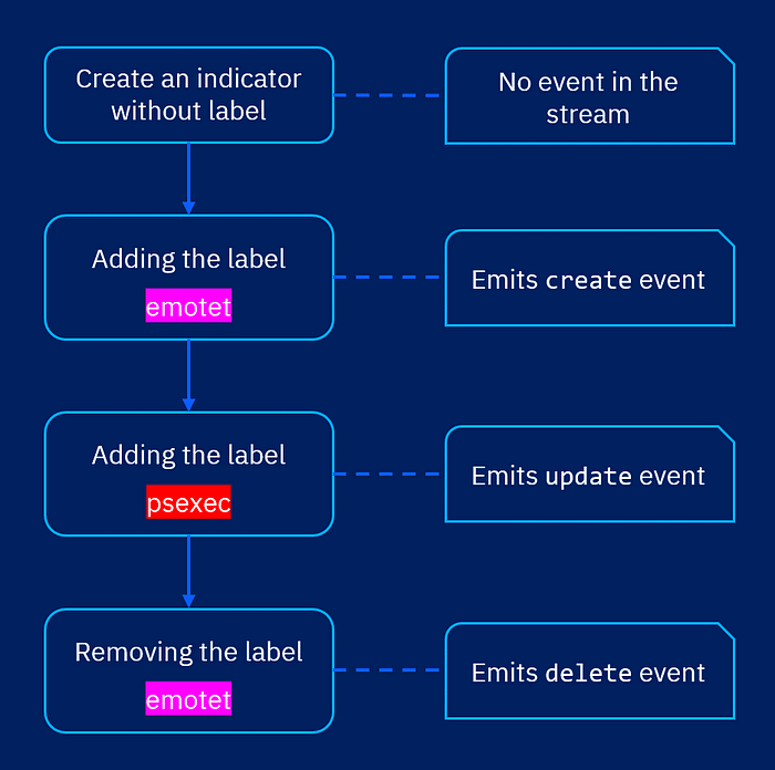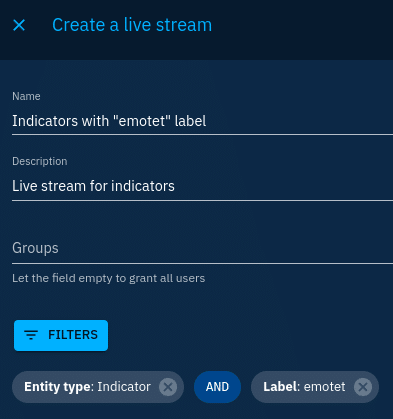 We create a live stream providing indicators with the label “emotet”.
