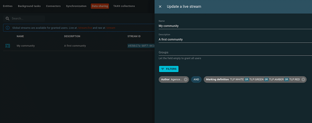 Beyond default raw and live streams, any user with the appropriate capabilities can also create his own live streams with filtering and group access restrictions directly in the OpenCTI user interface.