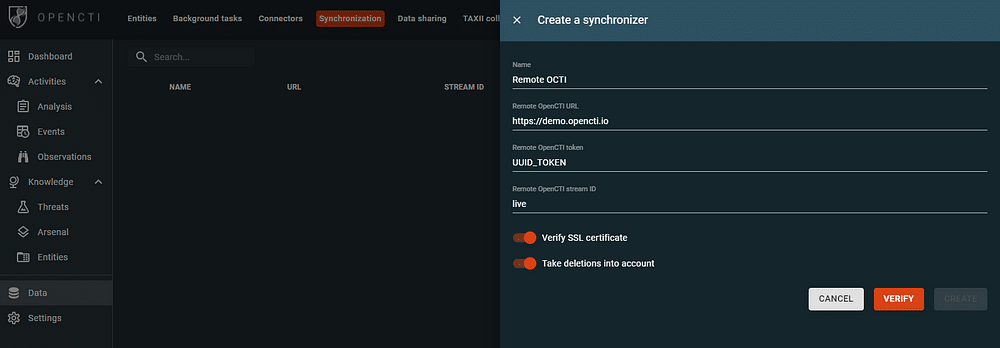Since OpenCTI 5.0.0, a built-in synchronization management feature is available in the user interface. To create a new synchronizer, an administrator should know the remote OpenCTI URL, token and live stream ID to consume. This, the embedded process will connect to the live stream of the remote OpenCTI, get the data as soon as its published in order to “create/update/delete” the elements.
