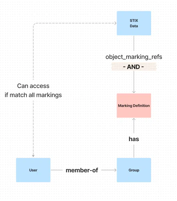 For instance, if an indicator is marked with TLP:AMBER and CLASSIFICATION:TOP-SECRET, the user must be at least granted to those 2 markings to have access to the data.