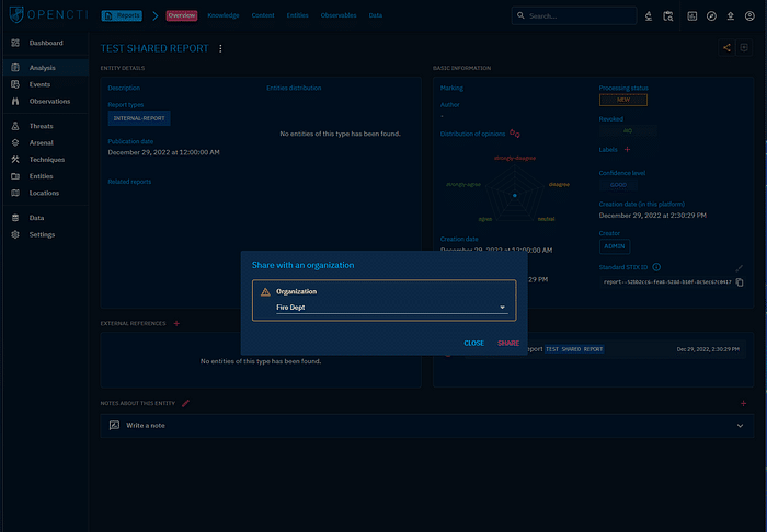 Organization sharing capability is built on top of other restrictions. It has been designed to work alonside the current marking definition segregation. Therefore, sharing a “TLP:RED report” with the Police department will be only accessible to the Police department users who can actually access to TLP:RED content.