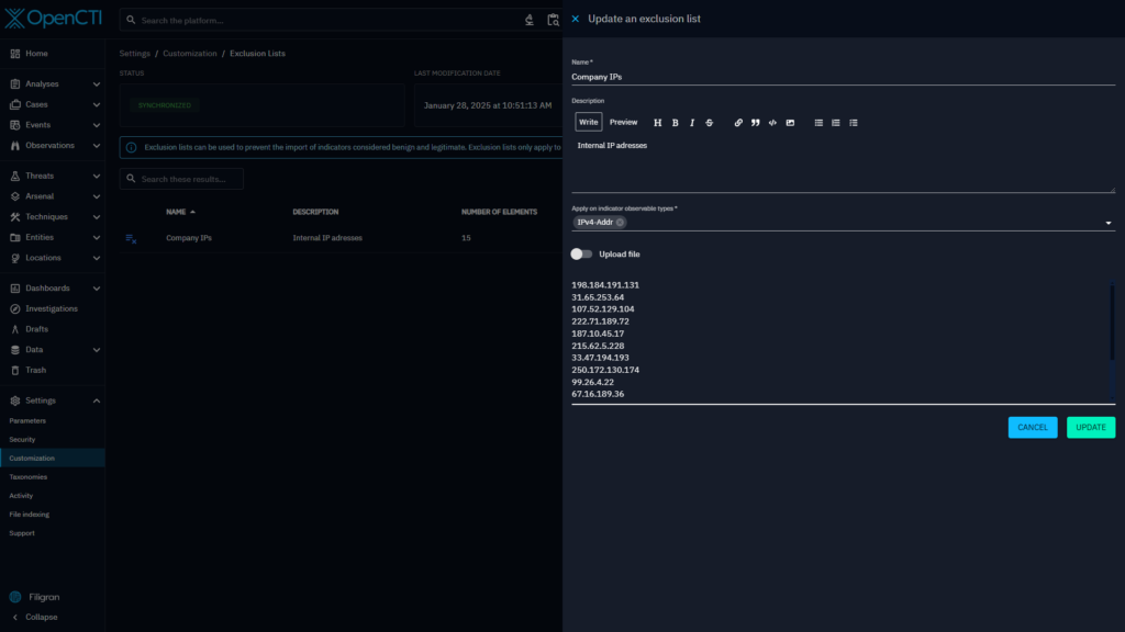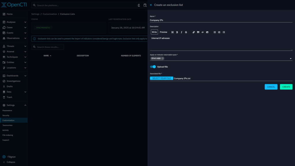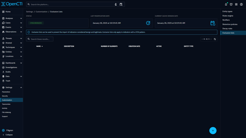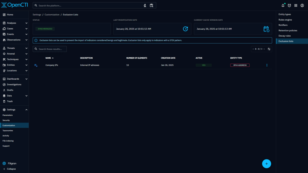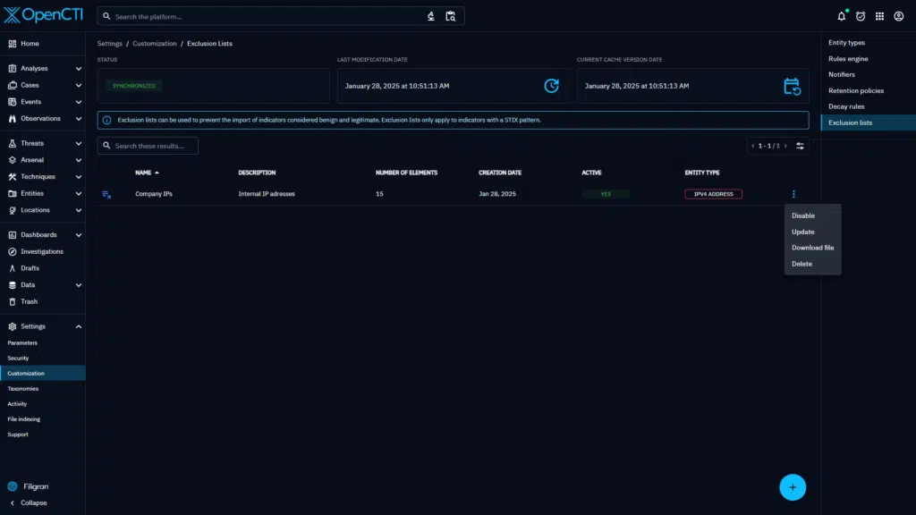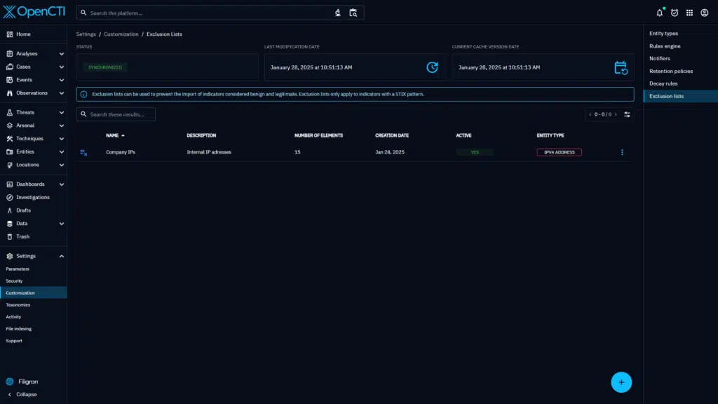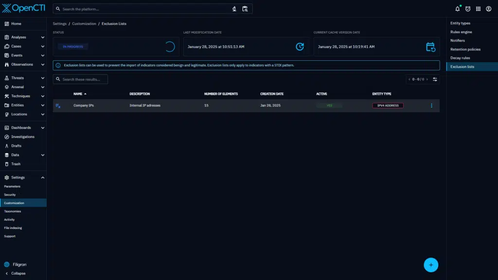 To solve this issue, version 6.5 of OpenCTI introduces a new type of settings customization: Exclusion lists.
