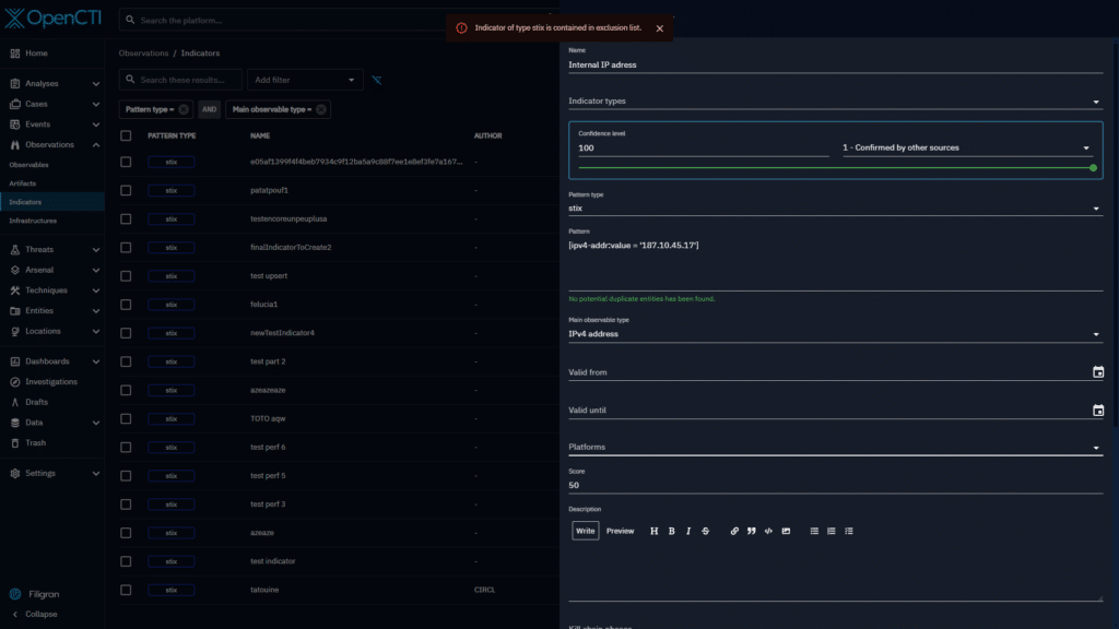 From now on, when an indicator is about to be created (regardless of the source: Connector, Feed ingestors or manually), if its pattern contains an observable value belonging to an exclusion list, the indicator will be blocked, displaying an error message of ‘Indicator of type stix is contained in exclusion list’.