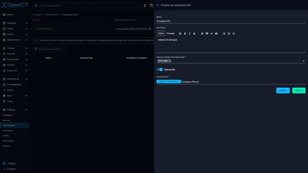 These exclusion lists give you the ability to define a list of indicator values that will be completely excluded from the platform. This means that if an indicator sent to the platform matches an indicator value contained in one of the exclusion lists, its creation will be rejected, and the indicator will not be ingested at all.
