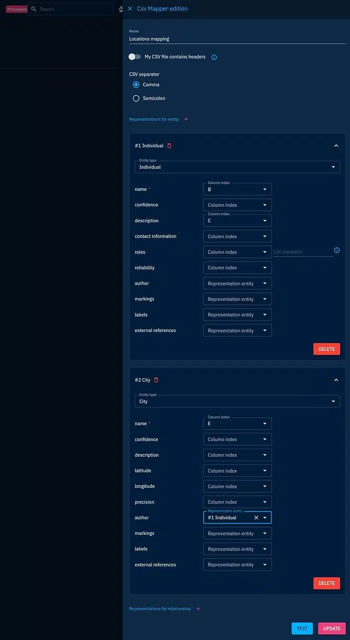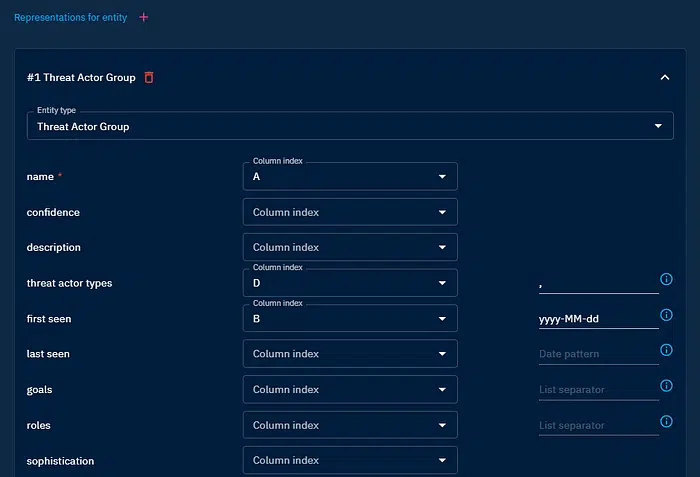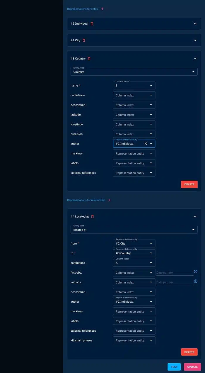 Users have the capability to define one or more Representations, which allows for the import of various data types in one go. Consequently, if your data encompasses multiple CTI elements such as indicators, threat actors, or other related entities within a single CSV file, the CSV Mapper guarantees an efficient and error-free import process.