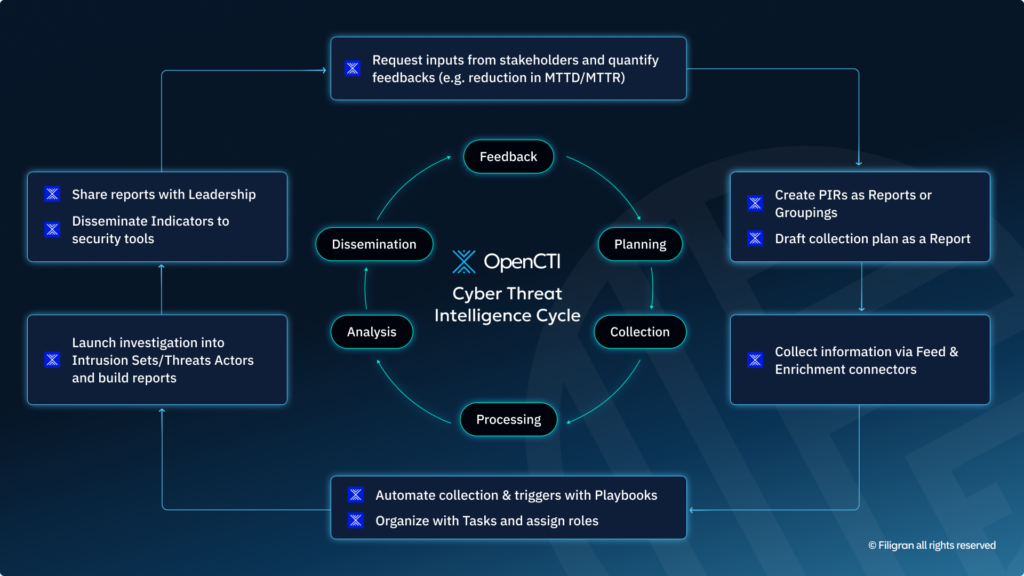 This article aims to guide organizations in implementing a robust Threat Intelligence program by detailing the steps of the intelligence cycle and how to leverage Filigran’s OpenCTI platform for each step.