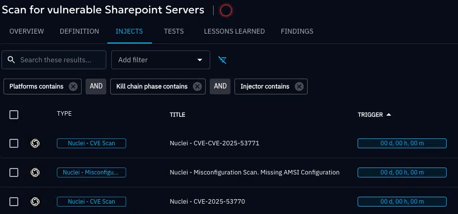 OpenBAS is a breach and attack simulation tool, allowing you to simulate real threat scenarios against your environment. Using the OpenBAS integration with Nuclei you can immediately launch agent-less scans against your assets, including your internet facing webservers and Sharpoint servers.