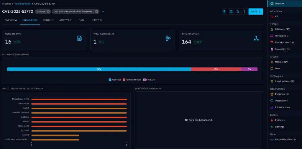 Leverage existing threat intelligence across open-source and closed source communities in OpenCTI in combination with the automation playbooks to create custom hunting feeds for CVE-2025-53770.
