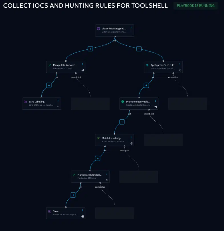 With a few clicks you can create no-code playbooks that send Yara, Snort, Suricata rules into your security tools, collected from your global threat intelligence sources, while collecting, enriching, and labelling IOCs that might go into a blocking list or are used for detection.